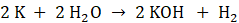 W 3. reakcji potas zareagował z wodą, w wyniku czego powstał wodorotlenek potasu oraz wodór. Stechiometrycznie liczymy z proporcji, ile gramów wodorotlenku potasu przypada na 0,5 g potasu. Następnie z proporcji liczmy, ile wodoru przypada na 0,5 g potasu.