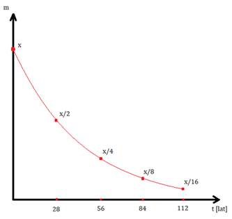Czas połowicznego rozpadu to czas, w którym masa próbki maleje dwukrotnie. Po upływie 50 lat jesteśmy blisko punktu, w którym masa próbki zmaleje 4-krotnie (aby w pełni zmalała 4 razy potrzebuje w sumie 56 lat). Ponieważ tylko szacujemy, wstawiamy współczynnik 4 do mianownika, określając masę 400 mg próbki na 100 mg po upływie 50 lat.