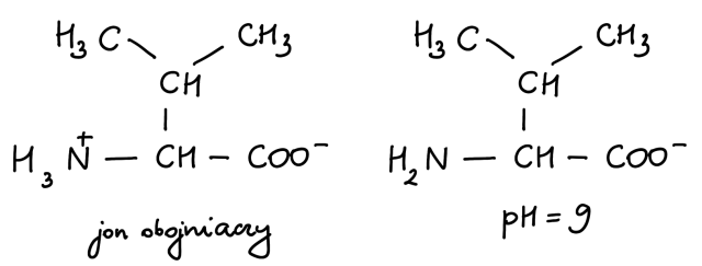 W tym zadaniu należy naszkicować wzory półstrukturalne jonu obojnaczego waliny oraz jej formę w środowisku o pH równym 9.