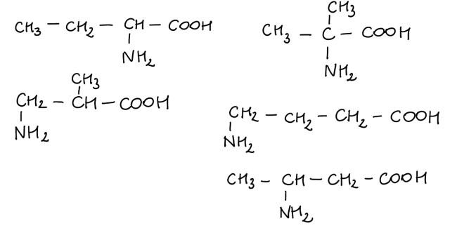 Wzory półstrukturalne będą różniły się ułożeniem grup funkcyjnych w cząsteczce (grupy aminowej, karboksylowej oraz metylowej).