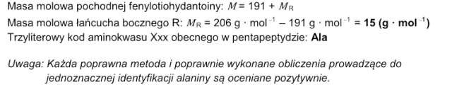 Oblicz, jaka jest masa molowa grupy R aminokwasu Xxx oraz zidentyfikuj badany aminokwas – napisz trzyliterowy kod tego aminokwasu.