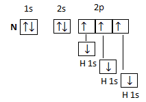 Azot ma trzy niesparowane elektrony. Trzy z nich uwspólnia z trzema elektronami wodorów z podpowłoki 1s – powstają trzy wiązania pojedyncze.