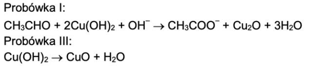 Zapisz w formie jonowej skróconej równanie reakcji przebiegającej w probówce I oraz – w formie cząsteczkowej równanie reakcji zachodzącej w probówce III podczas drugiego etapu doświadczenia, stosując wzory grupowe związków organicznych.