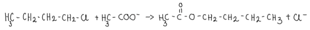 Zapisz sumaryczne równanie reakcji anionu octanowego z 1-chlorobutanem, stosując wzory półstrukturalne związków organicznych.