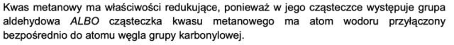 Wytłumacz, bazując na budowie cząsteczki, dlaczego kwas metanowy wykazuje właściwości redukujące.