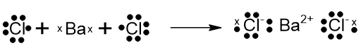Jest to wiązanie jonowe, więc elektrony zostają przekazane na atomy chloru, stąd powstaje kation baru i aniony chloru.