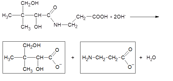 Uzupełnij schemat w taki sposób, aby przedstawiał w formie jonowej skróconej równanie hydrolizy zasadowej kwasu pantotenowego.
