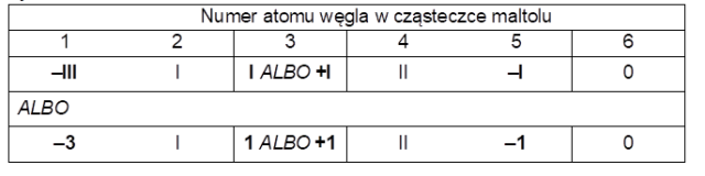 Uzupełnij tabelę, wpisując brakujące wartości formalnych stopni utlenienia atomów węgla w cząsteczce maltolu.