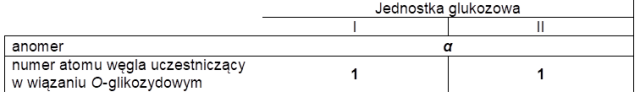 Uzupełnij tabelę, określając, z jakiego anomeru D-glukopiranozy (α czy β) powstały jednostki glukozowe I i II w cząsteczce trehalozy, oraz podaj numery atomów węgla, pomiędzy którymi występuje wiązanie O-glikozydowe w cząsteczce tego disacharydu.