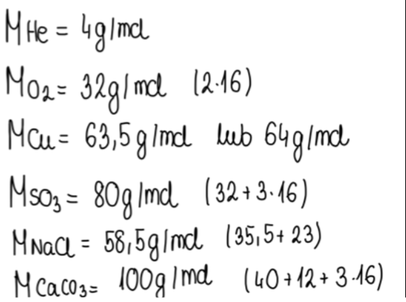 Podaj masy molowe poniższych substancji: hel, tlen, miedź, tlenek siarki(V) SO₃, chlorek sodu NaCl, węglan wapnia CaCO₃.