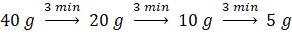 Po 3 minutach masa próbki będzie wynosiła połowę, czyli 20 g. Po kolejnych 3 minutach masa próbki będzie wynosiła połowę z 20 g, czyli 10 g, i po kolejnych trzech minutach – 5 g. W sumie daje to 9 minut.