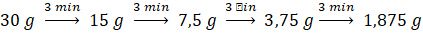 W tym zadaniu oblicz masę 30-gramowej próbki po 12 minutach, wiedząc, że czas połowicznego rozpadu wynosi 3 minuty.