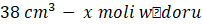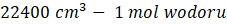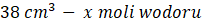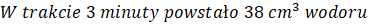 Objętość otrzymanego wodoru w trzeciej minucie możesz odczytać albo z tabeli, albo z wykresu i wynosi ona 38 cm3. 1 mol dowolnego gazu w warunkach normalnych zajmuje objętość 22400 cm3, więc 38 cm3 zajmuje x moli wodoru: