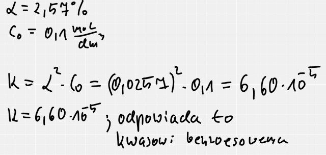 Zadanie obliczono z prawa rozcieńczeń Ostwalda. Ponieważ stopień dysocjacji jest mniejszy niż 5% możemy zapisać skrócony wzór na K, widoczny w rozwiązaniu.