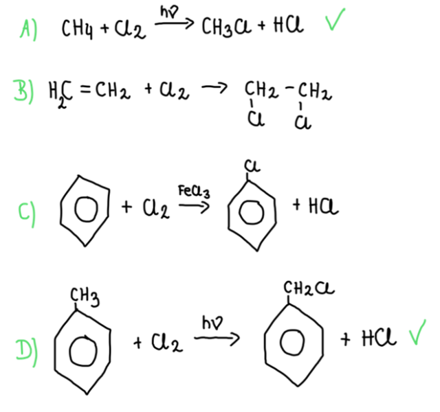 Reakcja substytucji rodnikowej odbywa się zawsze w obecności światła, pod wpływem którego powstają rodniki- cząstki silnie reaktywne przez wzgląd na posiadanie jednego niesparowanego elektronu na powłokach.