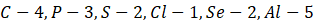 W tym zadaniu napisz, ile elektronów powinny przyjąć atomy węgla, fosforu, siarki, chloru, selenu, glinu, aby konfiguracja elektronowa była identyczna z konfiguracją najbliższego gazu szlachetnego.