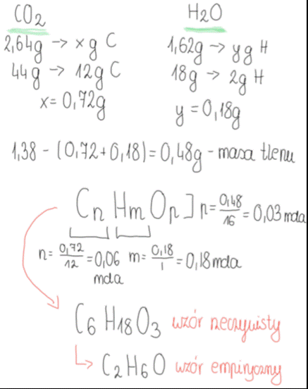 3. Od całkowitej masy związku odejmujemy wyliczone masy węgla i wodoru, a pozostała masa świadczy o obecności trzeciego pierwiastka we wzorze związku- tlenu.