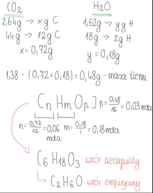 3. Od całkowitej masy związku odejmujemy wyliczone masy węgla i wodoru, a pozostała masa świadczy o obecności trzeciego pierwiastka we wzorze związku- tlenu.