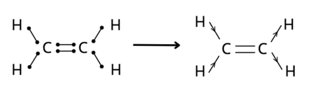 Rodzaj wiązania zależy od różnicy elektroujemności w cząsteczkach. Wartości elektroujemności zawarte są w układzie okresowym. CH2=CH2 utworzony jest przez dwa atomy węgla i cztery atomu wodoru. Atomom węgla brakuje do oktetu elektronowego po cztery elektrony, a każdemu z atomów wodoru – po jednym. Stąd dochodzi do uwspólnienia elektronów. Wiązanie między wodorem a węglem jest spolaryzowane, ponieważ różnica elektroujemności między tymi atomami mieści się w zakresie 0,4 – 1,7: