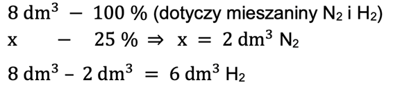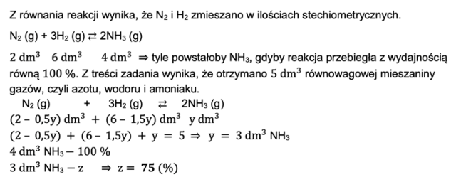 Na podstawie odpowiednich obliczeń ustal wydajność reakcji syntezy amoniaku w opisanych warunkach, a wynik przedstaw w procentach.