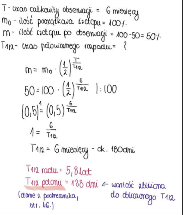 Badana próbka zawierała substancję promieniotwórczą, którą mógł być izotop Ra-228 lub Po-210. Zaobserwowano, że w ciągu 6 miesięcy jej aktywność spadła o więcej niż połowę. Określ, który z tych radionuklidów był obecny w próbce.