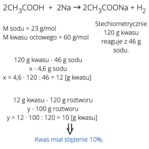 Oblicz stężenie procentowe kwasu octowego, jeśli w reakcji 4,6 g sodu z 120 g tego kwasu przereagowały wszystkie substraty.