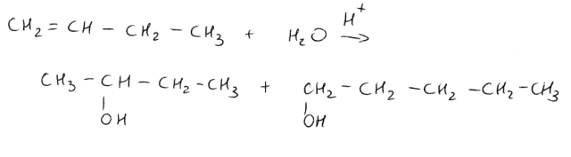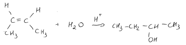 b) Addycja wody do alkenu (Wodór i grupa hydroksylowa przyłączają się do dwóch atomów węgla rozrywając wiązanie podwójne między nimi)