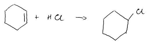 e) Addycja wodorku halogenu do alkenu (Wodór i halogen przyłączają się do dwóch atomów węgla rozrywając wiązanie podwójne między nimi)