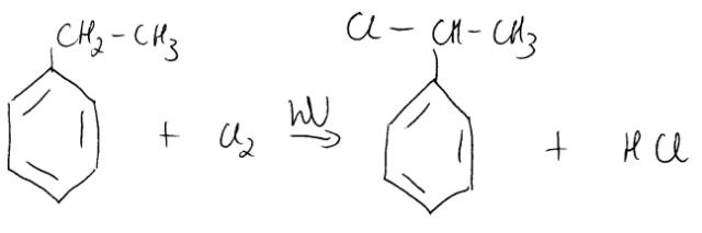 Napisz jaki chiralny związek powstaje w wyniku chlorowania etylobenzenu. Określ warunki, jakie muszą zajść, aby przeprowadzić opisaną reakcje.
