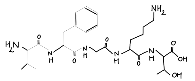 W tym zadaniu należy podać sekwencję aminokwas oraz wzór półstrukturalny na podstawie podanych informacji.