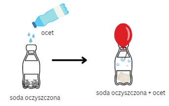 Opis: Do butelki PET wsyp 5 łyżeczek sody oczyszczonej następnie wlej 50 ml octu. Następnie. Na wlot butelki załóż balon. Następnie, ostrożnie zdejmij balon i zawiąż go, tak aby nie uciekła z niego gazowa zawartość. Puść balon w powietrze i zaobserwuj kierunek lotu.