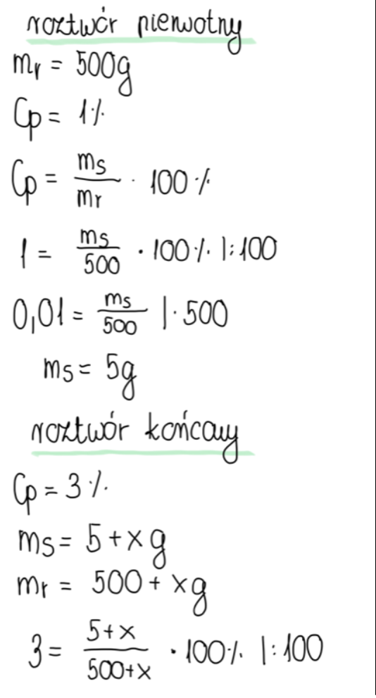 Oblicz, ile gramów soli kuchennej trzeba dodać do 500 g jej roztworu o stężeniu 1%, aby uzyskać roztwór o stężeniu 3%.