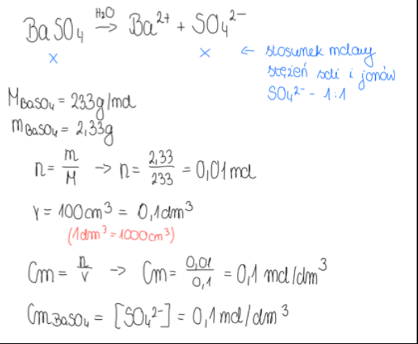 Oblicz molowe stężenie jonów SO42- w roztworze, jeżeli z 100 cm3 tego roztworu otrzymano 2,33 g osadu BaSO₄ (po przemyciu i wysuszeniu).