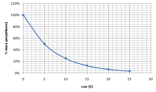 Wykres należy sporządzić umieszczając na osi OY % masy początkowej, a na osi OX czas. Następnie należy zaznaczyć charakterystyczne punkty – 50% masy początkowej próbki po 5 h, 25% masy próbki po 10 h itd. Połączenie punktów wykresu obrazuje, jak zmienia się masa pierwiastka promieniotwórczego w czasie.