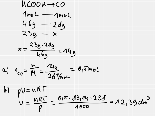 W tym zadaniu musisz obliczyć objętość tlenku węgla (II), która wydzieli się w wyniku dehydratacji 23g kwasu metanowego, jeśli gaz odmierzono w T=25℃ i pod ciśnieniem 1000 hPa. Wynik podaj z dokładnością do dwóch miejsc po przecinku.