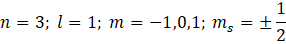 b) n = 3, l = 1, m = -1, ms = 1/2