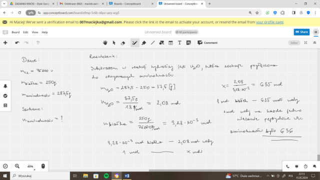 W tym zadaniu musisz obliczyć, ile aminokwasów uległo reakcji polikondensacji, jeśli wyniku całkowitej hydrolizy 250 g tego białka otrzymano 287,5 grama mieszaniny aminokwasów.
