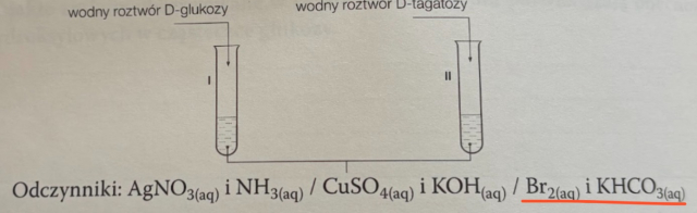W tym zadaniu musisz wybrać jedną parę odczynników, która umożliwia odróżnienie D-glukozy od D-tagatozy. Uzupełnij schemat doświadczenia. Podkreśl wzory wybranych odczynników.