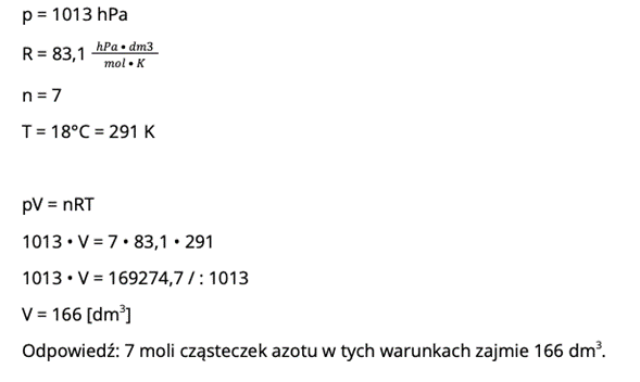 Jaka jest w objętość 7 moli cząsteczek azotu w temperaturze 18°C i pod ciśnieniem 1020 hPa?