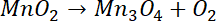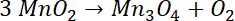Nie zgadza się liczba atomów manganu (po lewej jeden, po prawej trzy) oraz atomów tlenu (po lewej dwa, po prawej sześć). Wpisanie liczby trzy przed tlenkiem manganu sprawi, że liczba atomów tlenu i manganu będzie taka sama po obu stronach równania.
