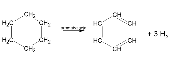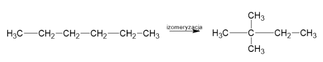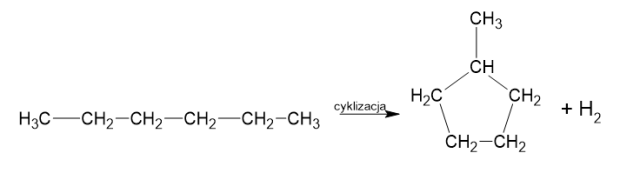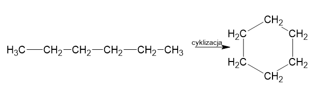 Heksan ulega izomeryzacji, tworząc 2,2-dimetylobutan, natomiast może ulegać cyklizacji, tworząc albo cykloheksan, albo metylocyklopentan. Z kolei cykloheksan ulega reakcji aromatyzacji w benzen.