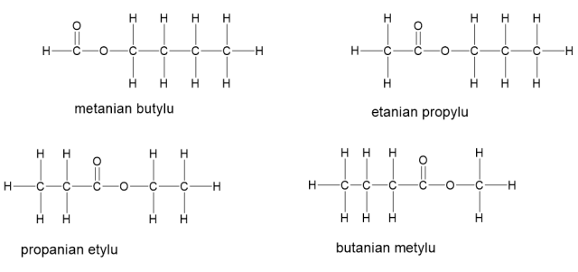 W tym zadaniu zapisz wzory strukturalne i nazwy systematyczne czterech różnych estrów o wzorze C5H10O2, a następnie określ rodzaj izomerii.