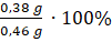 Obliczamy wydajność, znając masę powstałą (0,38 g) i masę, jaka powinna powstać przy wydajności 100% (0,46 g):