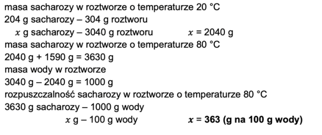 Na podstawie odpowiednich obliczeń ustal rozpuszczalność sacharozy (w gramach na 100 gramów wody) w temperaturze 80°C, jeśli w temperaturze 20°C jest ona równa 204 g na 100 g wody.