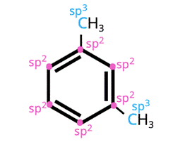 Hybrydyzacja orbitali atomowych zależy od liczby wiązań pomiędzy atomami węgla. Jeśli tworzy z innym atomem węgla tylko wiązanie pojedyncze to jego hybrydyzacja to sp3. Jeśli tworzy z innym atomem węgla wiązanie podwójne to jego hybrydyzacja to sp2. Jeśli natomiast tworzy wiązanie potrójne z innym atomem węgla – sp. Spójrz na wiązania w m-ksylenie, by określić hybrydyzację. W pierścieniu benzenu jest zdelokalizowane wiązanie pi – sugeruje to hybrydyzację sp2 atomów węgla w pierścieniu. Podstawniki metylowe łączą się tylko z jednym atomem węgla poprzez wiązanie pojedyncze – stąd ich hybrydyzacja to sp3.