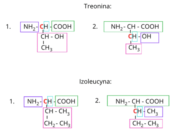 Zdanie 4: W cząsteczkach treoniny i izoleucyny można wyróżnić dwa asymetryczne atomy węgla. W tablicach aminokwasów odszukaj budowę podanych aminokwasów. Asymetryczny (chiralny) atom węgla to taki z czterema różnymi podstawnikami. Asymetryczne atomy węgla zaznaczono na czerwono. W ramkach zaznaczono podstawniki.