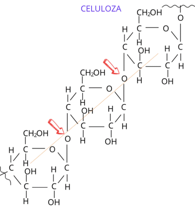 Monomerem celulozy są cząsteczki beta-glukozy, które łączą się wiązaniami beta-1,4-O-glikozydowymi (przedstawione na rysunku).