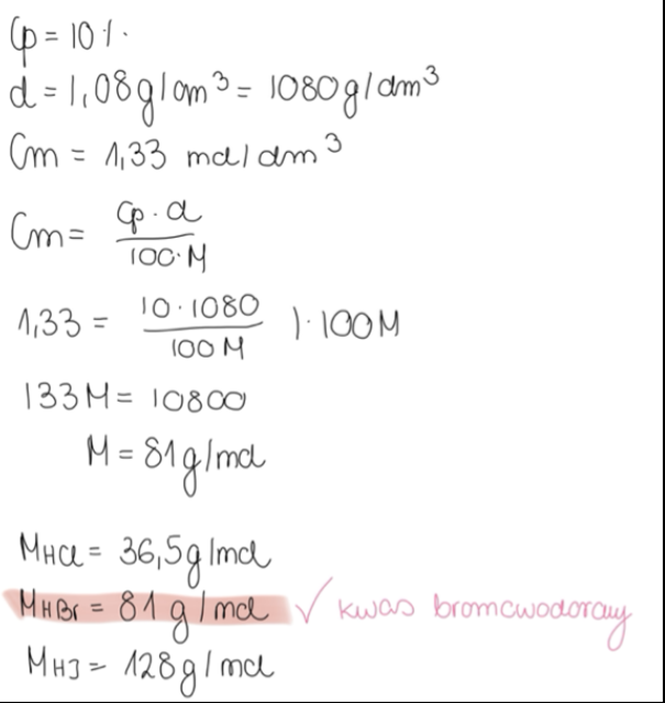 Roztwór pewnego kwasu o stężeniu 10% ma gęstość równą 1,08 g/cm3. Ustal, czy jest to kwas chlorowodorowy, bromowodorowy czy jodowodorowy, wiedząc, że jego stężenie molowe wynosi 1,33 mol/dm3.