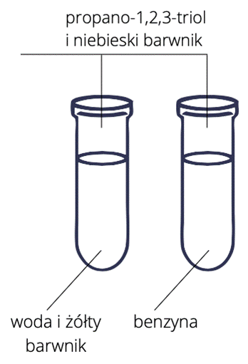 Odczynniki: woda, benzyna, propano-1,2,3-triol, żółty i niebieski barwnik