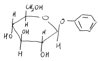 Do grupy hydroksylowej przy pierwszym atomie węgla w cząsteczce glukozy podłączamy pierścień aromatyczny stanowiący resztę z fenolu w pozycji .